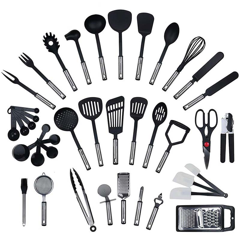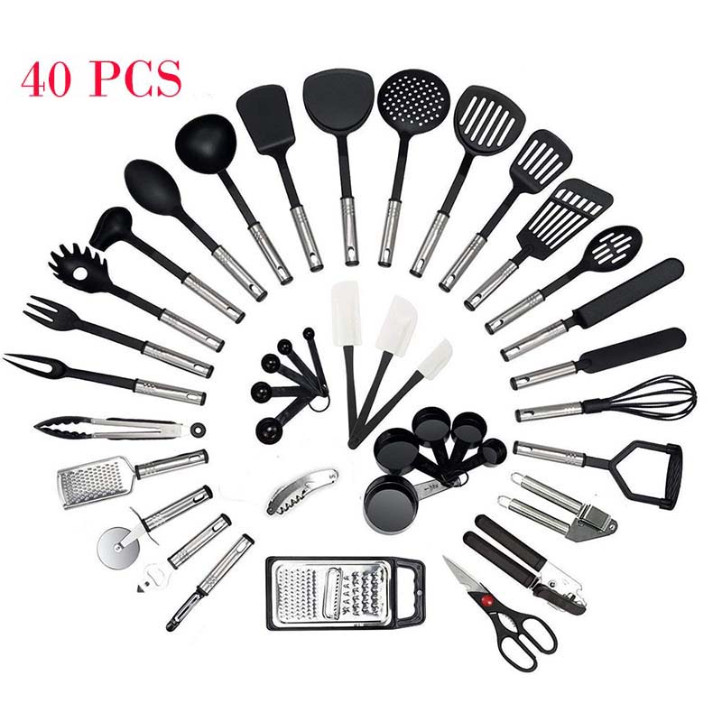Product: Kitchen Accessories Material: Nylon + PP + 410 stainless steel Type: Utensils Quantity: 40 pieces Weight: 1.5kg Usage: BBQ, Baking, Kitchen Home, House Cooking Certification: FDA, LFGB, CE / EU, CIQ, SGS, EEC